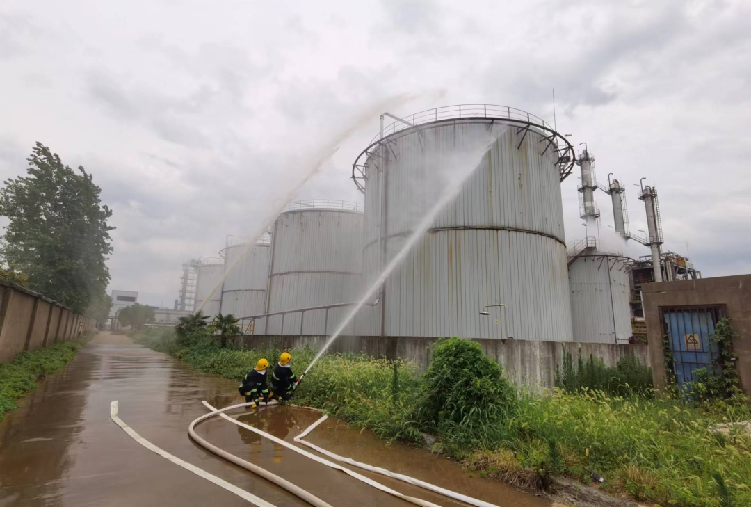 到达现场后,车间主任退至安全区域向现场指挥官汇报现场情况:“报告指挥官!现场火情得到初步控制,部分救援人员受伤需要支援。”随后开启周围储罐喷淋装置进行降温冷却。