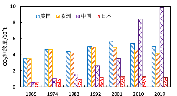 根据2015年12月通过的《巴黎协定》中提到的长期目标,全球气温升高相比工业化前控制在2℃以内,力争控制在1.5℃以内。根据最新研究报告,为控制气温升高在1.5℃左右,到2030年左右必须大幅降低碳排放量到2010年的45%。2019年石化能源占全球一次能源利用的84%,CO2排放量为3.42×1010 t,其中我国排放量约占28.6%,我国碳排放量增速为2.5%,高于全球平均水平1.1个百分点,如图1所示。2019年全球能源消费油当量为144×108t;我国石油与天然气消费碳排放量分别为15.2×109t和5.9×109t,占全国总排放量的21%。据2021年世界能源统计数据显示,2020年我国CO2排放总量位居世界第一,其中石化行业CO2排放总量占比较大,石化行业碳减排迫在眉睫,同时面临巨大挑战。