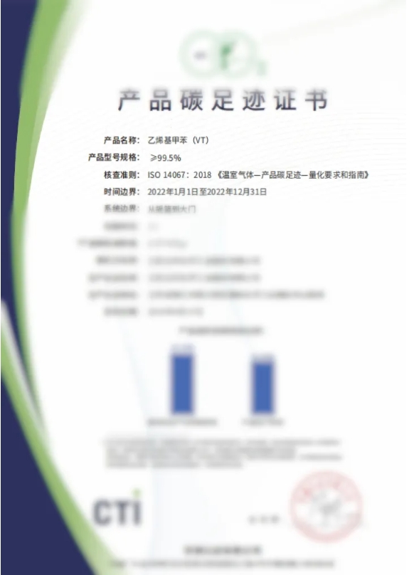 在国家“双碳”目标引领下,可持续发展、绿色转型已成为社会共识,各行业绿色低碳转型的步伐不断加快。近日,华测认证有限公司(以下简称“CTI华测认证”)为江苏和记集团官网化学工业股份有限公司(以下简称“和记集团官网股份”)旗下的乙烯基甲苯(VT)产品颁发产品碳足迹证书。
