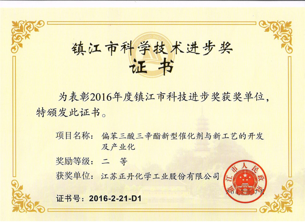 江苏和记集团官网化学工业股份有限公司作为国内主要的偏苯三酸三辛酯生产企业,一直致力于偏苯三酸三辛酯生产技术的改进和工艺优化,提高企业核心竞争力。公司组织科研技术力量,经过不懈努力、反复攻关,实现了一种绿色催化合成偏苯三酸三辛酯的新工艺,并形成多项自主知识产权(获得国家授权发明专利2项,实用新型专利1项)。公司将专利技术进行成果转化,成功实施“偏苯三酸三辛酯新型催化剂与新工艺的开发及产业化”项目并获得“2016年度镇江市科学技术进步奖 二等奖”。