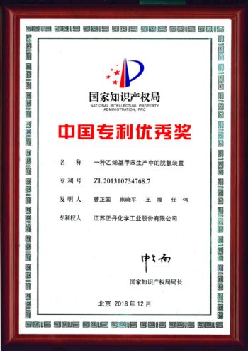 近日,公司自主研发的发明专利“一种乙烯基甲苯生产中的脱氢装置” (专利号:ZL201310734768.7)荣获国家知识产权局颁发的第二十届中国专利优秀奖。