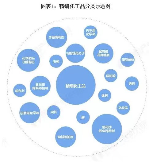 各国的分类方法不尽相同,精细化学品包括的范围也不完全一致。目前,中国精细化学品大体上包括:农药、染料、涂料(包括油漆和油墨)、颜料、试剂和高纯物质、信息用化学品(包括感光材料、磁性材料等能接受电磁波的化学品)、食品和饲料添加剂、粘合剂、催化剂和各种助剂、(化工系统生产的)化学药品(原料药)和日用化学品、高分子聚合物中的功能高分子材料(包括功能膜,偏光材料等)等在内的11类。随着国民经济的发展,精细化学品的开发和应用领域将不断开拓,新的门类将不断增加。