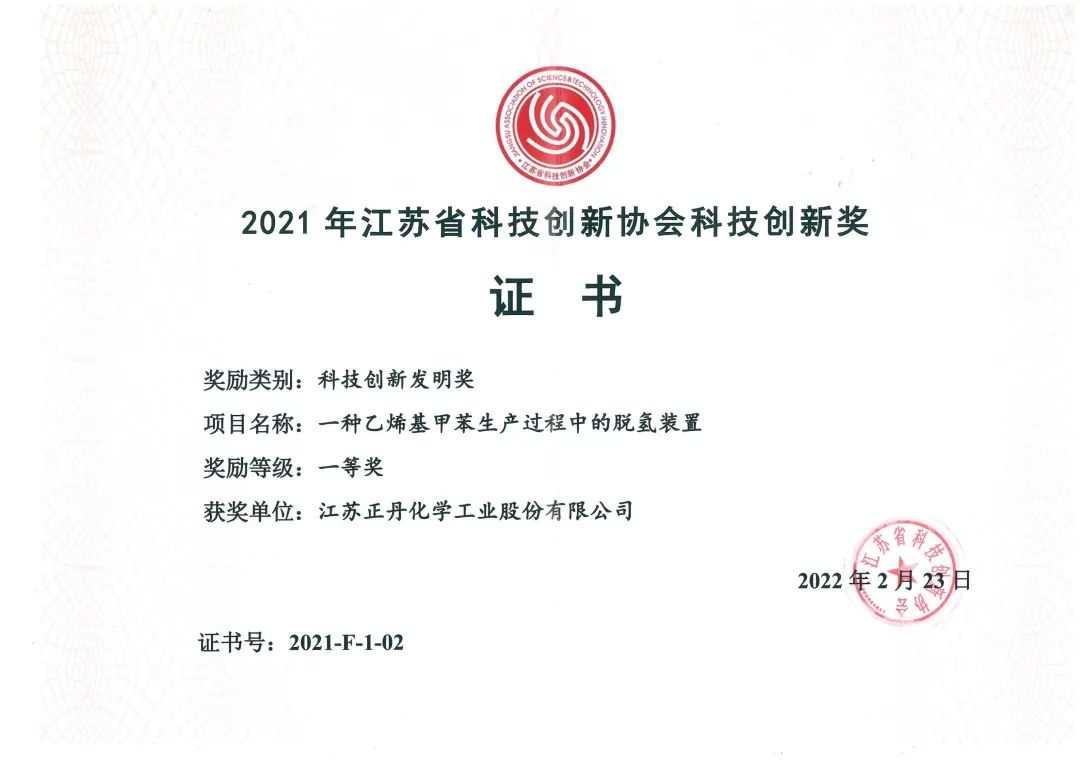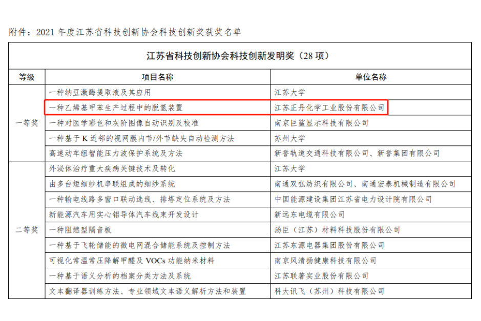 近日,江苏省科技创新协会发布“关于2021年度江苏省科技创新协会科技创新奖评奖结果的通报”,江苏和记集团官网化学工业股份有限公司所发明的“一种乙烯基甲苯生产过程中的脱氢装置”荣获江苏省科技创新协会科技创新发明奖一等奖。